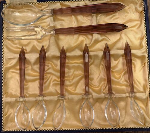 Glasbesteck Art Deco um 1930 Böhmen inkl. Original Etui Amethyst Farbiges Glas Im Angebot