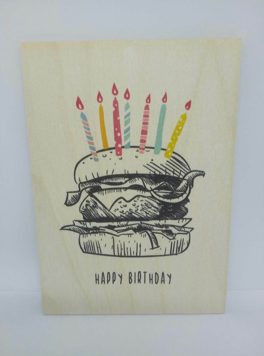 Holzpostkarte magnetisch "Happy Birthday" Burger 14x10 Birkenholz 50284 Im Angebot