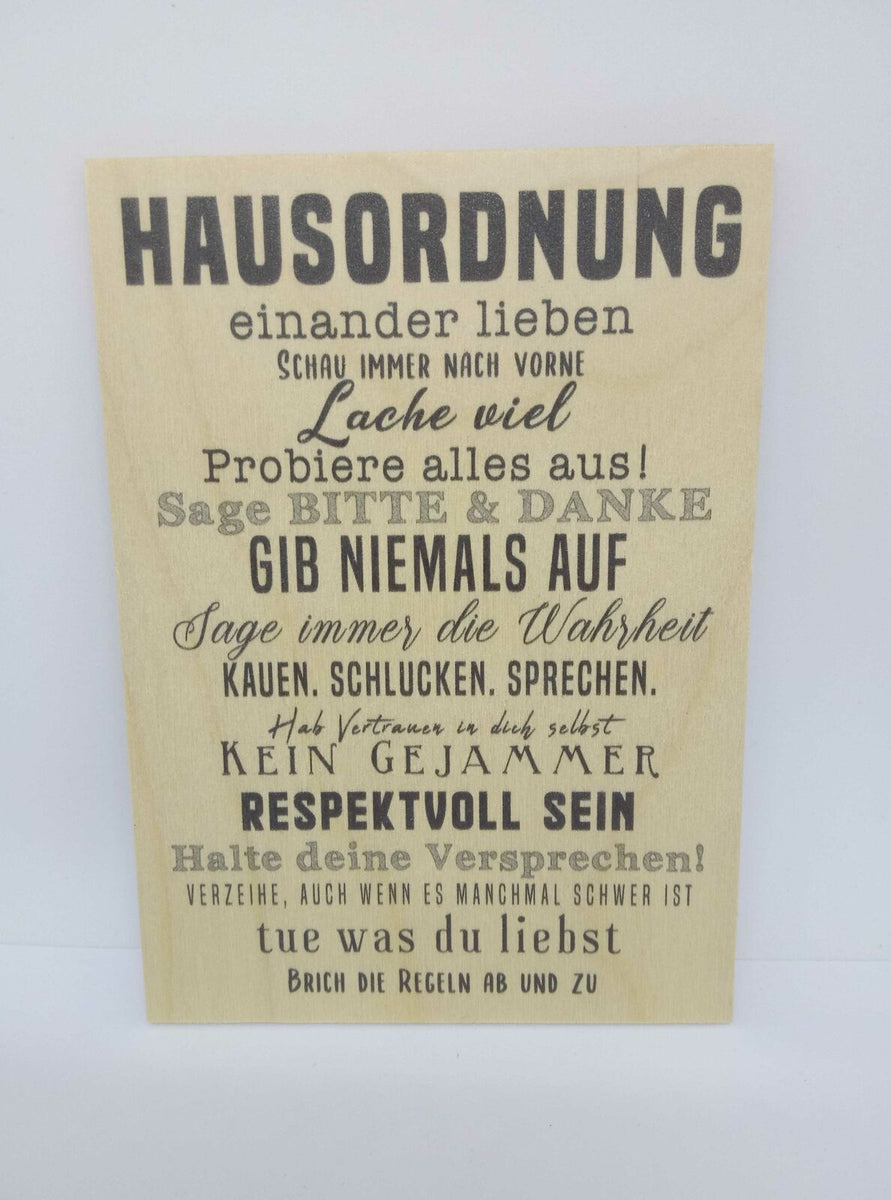 Holzpostkarte magnetisch Hausordnung Spruch s. Bild 14x10 Birkenholz 50292 Im Angebot