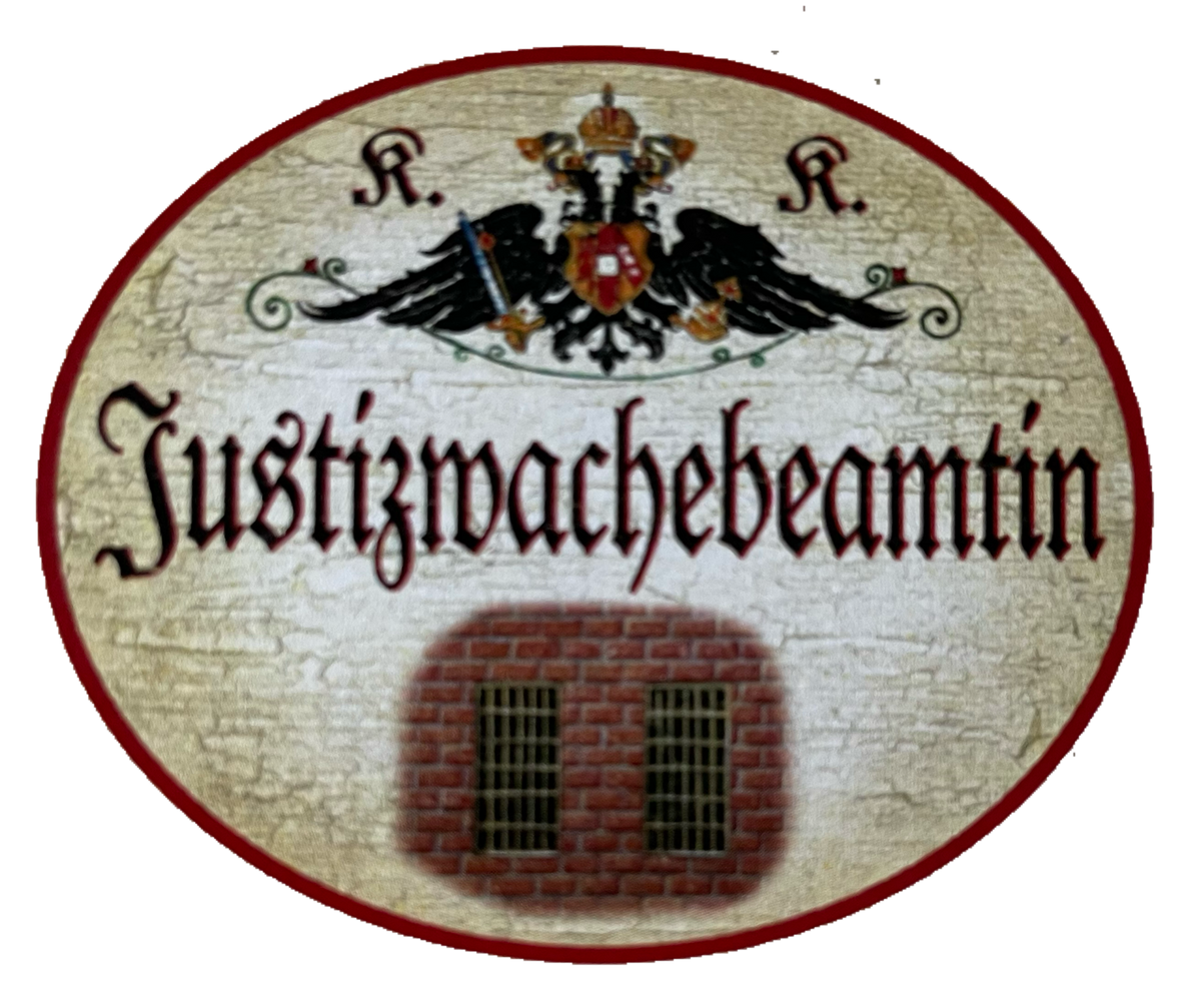Das Schild zeigt den prägnanten Schriftzug "Justizwachebeamtin", der klar und deutlich ins Auge fällt. Diese auffällige Beschriftung wird durch eine ansprechende, nostalgische Schriftart ergänzt, die an vergangene Zeiten erinnert und zugleich die Bedeutung des Wachdienstes hervorhebt. Ein ideales Stück für Büros, Warteräume oder im Einsatzort selbst – es setzt ein Zeichen der Professionalität und des Engagements.