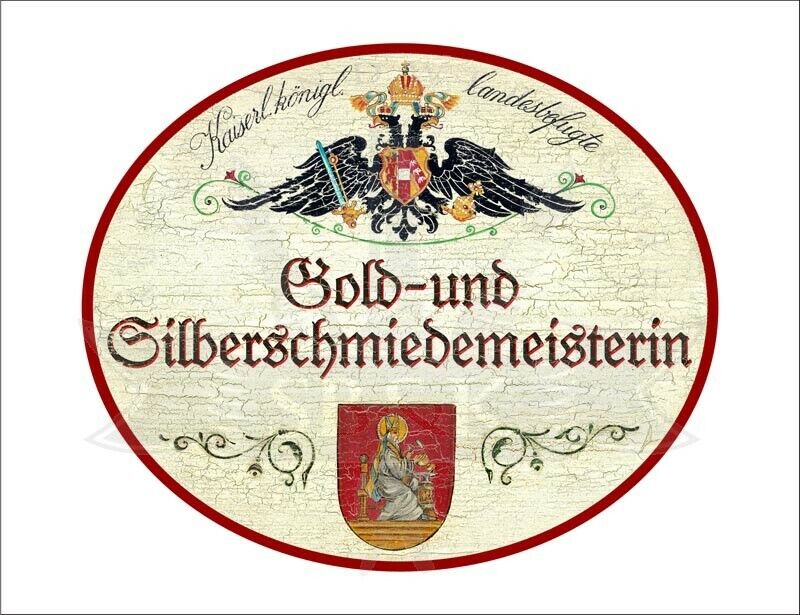 KuK Nostalgie Holzschild - Landesbefugte Gold- und Silberschmiedemeisterin TH Im Angebot