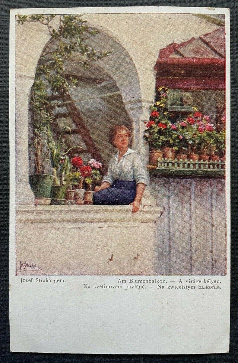 Malerei Am Blumenbalkon J.Straka Frau Blumenstock Bluse Rock Haus 410783 TH Im Angebot