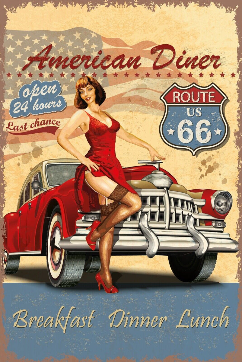 Nostalgie Schild American Diner Route66 Auto 12x18 / 20x30 / 30x40 Blech od.Holz Im Angebot