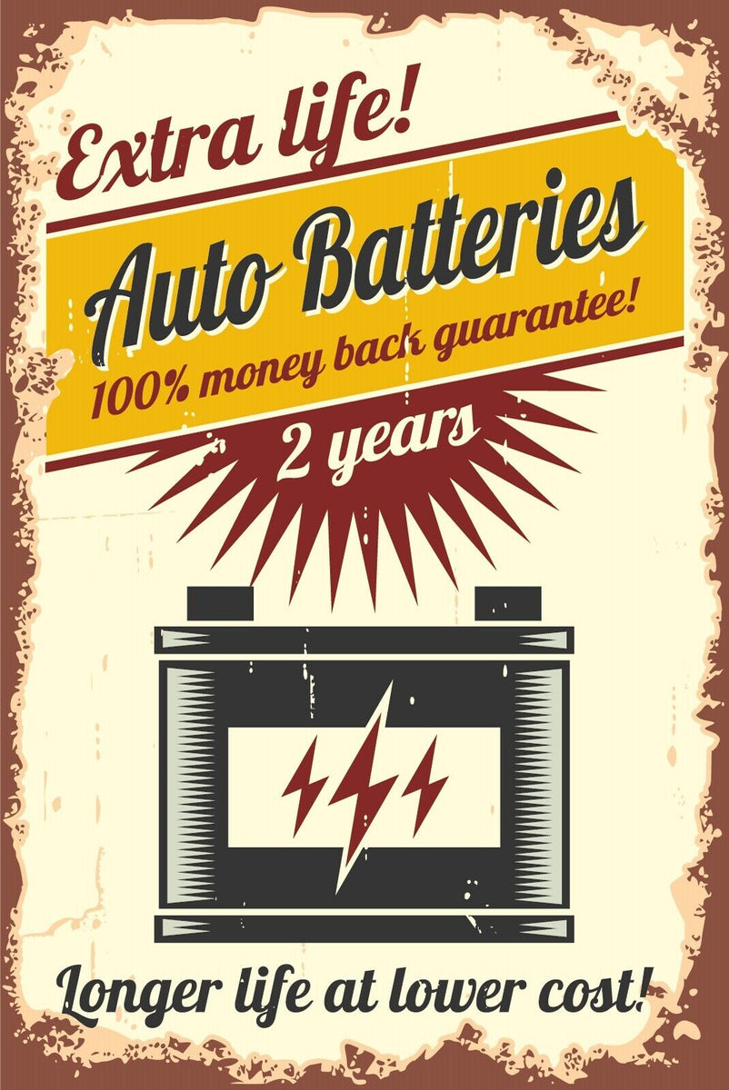 Nostalgie Schild Auto Batteries Extra Life! 12x18 / 20x30 / 30x40 Blech od. Holz Im Angebot