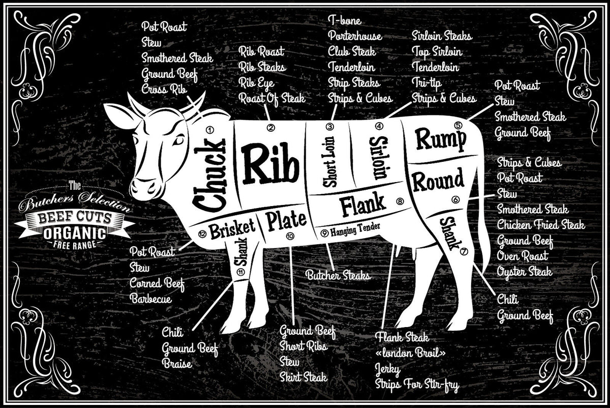 Nostalgie Schild Beef Cuts Kuh Rind Diagramm 12x18 / 20x30 / 30x40 Blech od.Holz Im Angebot