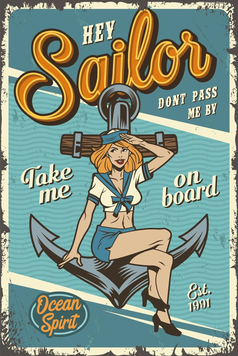 Nostalgie Schild Hey Sailor Ozean Matrosin 12x18 / 20x30 / 30x40 Blech od. Holz Im Angebot