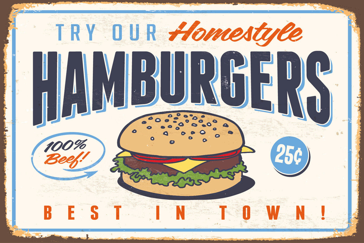 Nostalgie Schild Homestyle Hamburgers Beef 12x18 / 20x30 / 30x40 Blech od. Holz Im Angebot