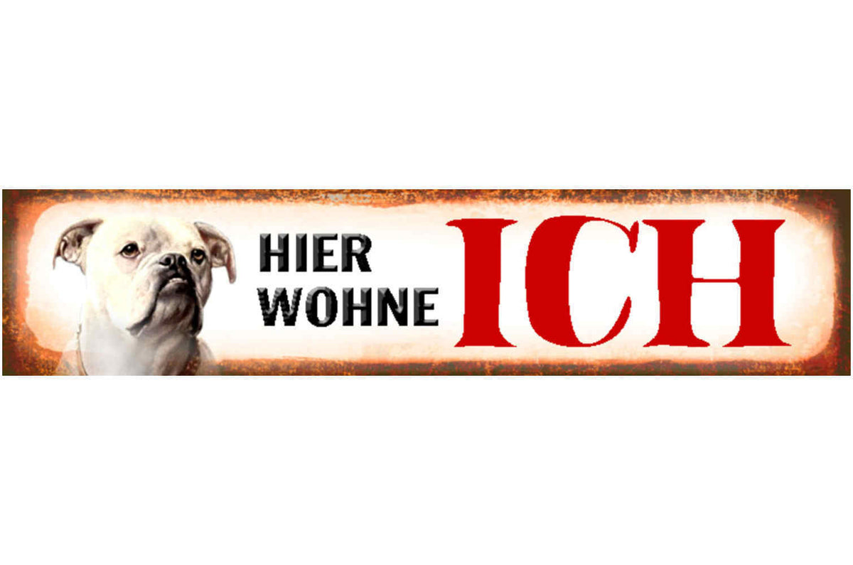 Schild Hier wohne Ich Bulldogge Hund Haus Tier Liebe 46 x 10 Blech od. Holz Im Angebot