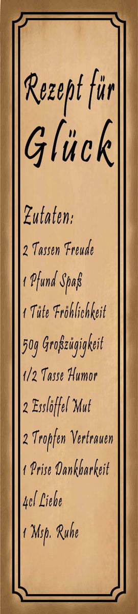 Entdecken Sie unser einzigartiges Schild "Rezept Glück Glücklich Freude Spaß Fröhlichkeit" in den Maßen 46 x 10 cm – erhältlich aus hochwertigem Blech oder Holz. Dieses charmante Dekorationsobjekt ist mehr als nur ein einfacher Wandschmuck; es ist eine lebensbejahende Botschaft, die geradezu dazu einlädt, Ihr Zuhause mit positiven Gedanken und guter Laune zu bereichern.