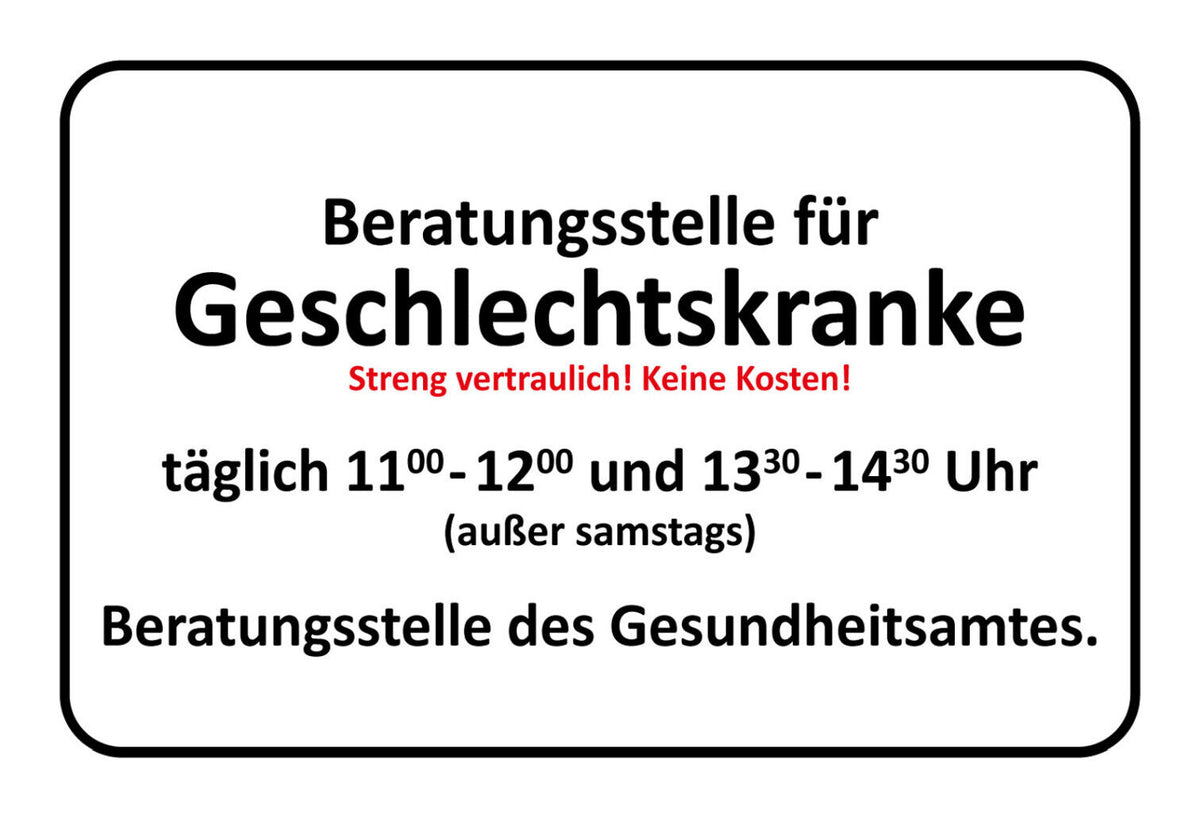 Schild Spruch Beratungsstelle für Geschlechtskranke Streng vertraulich Keine JW Im Angebot