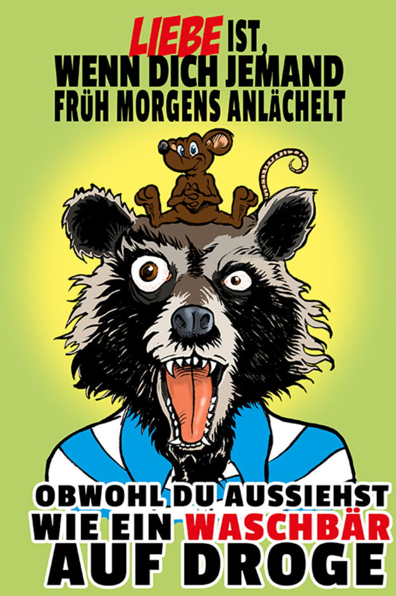 Schild Spruch Liebe ist wenn dich jemand früh morgens anlächelt Waschbär DrogeJW Im Angebot