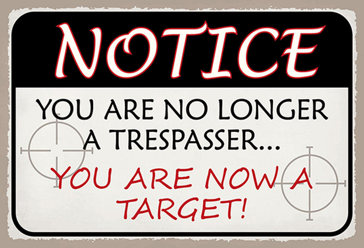 Schild Spruch Notice You are no longer tresspasser but target Nicht länger JW Im Angebot