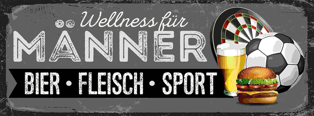 Schild Wellness Für Männer Bier Fleisch Sport Bier Burger 27x10 Blech od.Holz Im Angebot