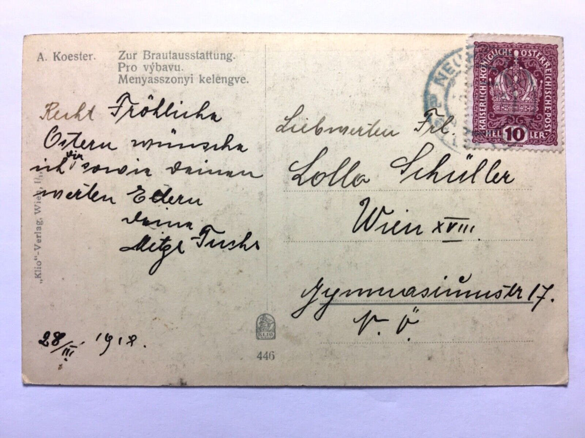 Zur Brautaustattung (A.Koester) - Frau näht Kleid - Künstlerkarte 50019 TH D Im Angebot