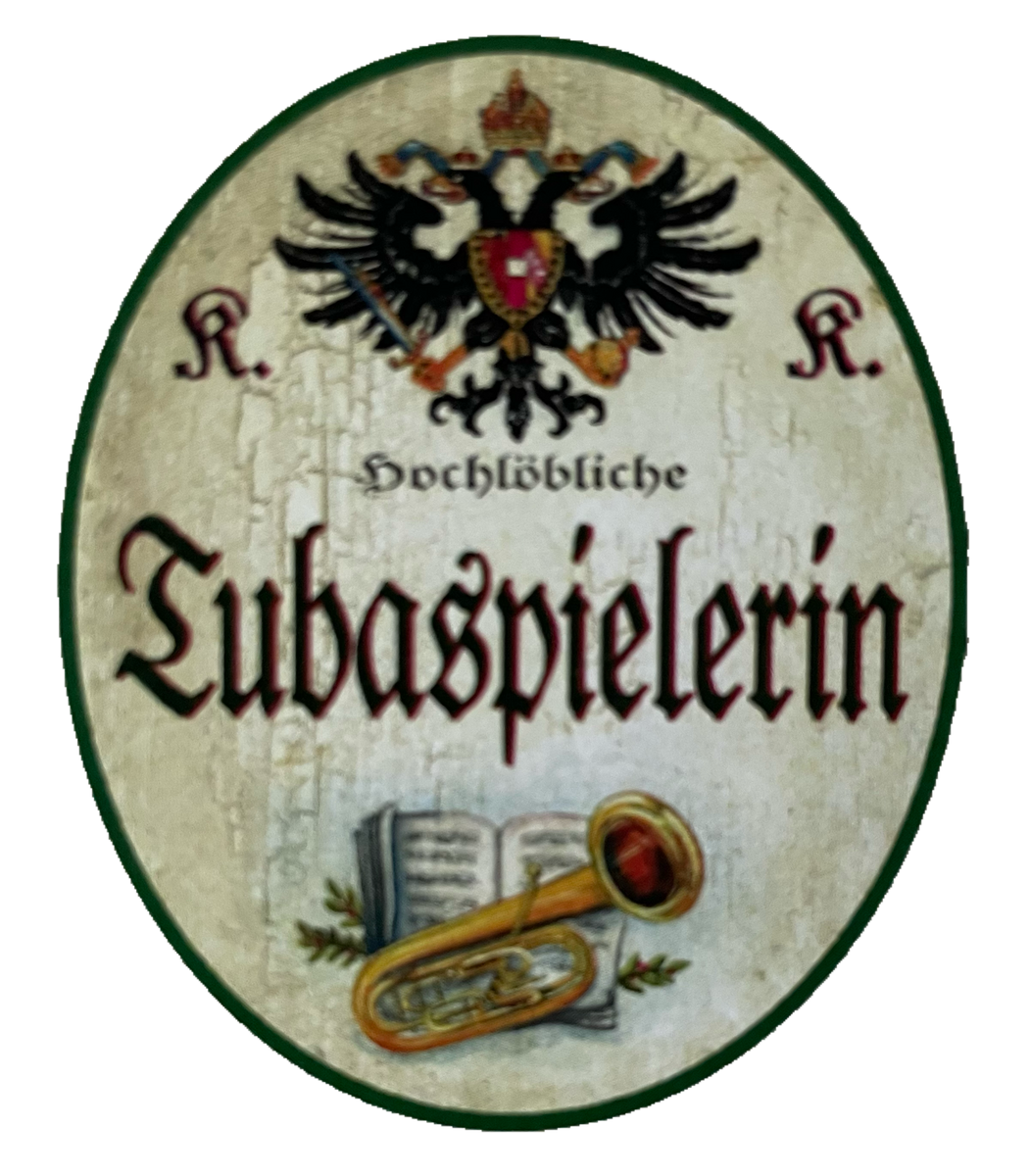 KuK Nostalgie Holzschild Hochlöbliche Tubaspielerin Tuba Blasinstrument Schild Im Angebot